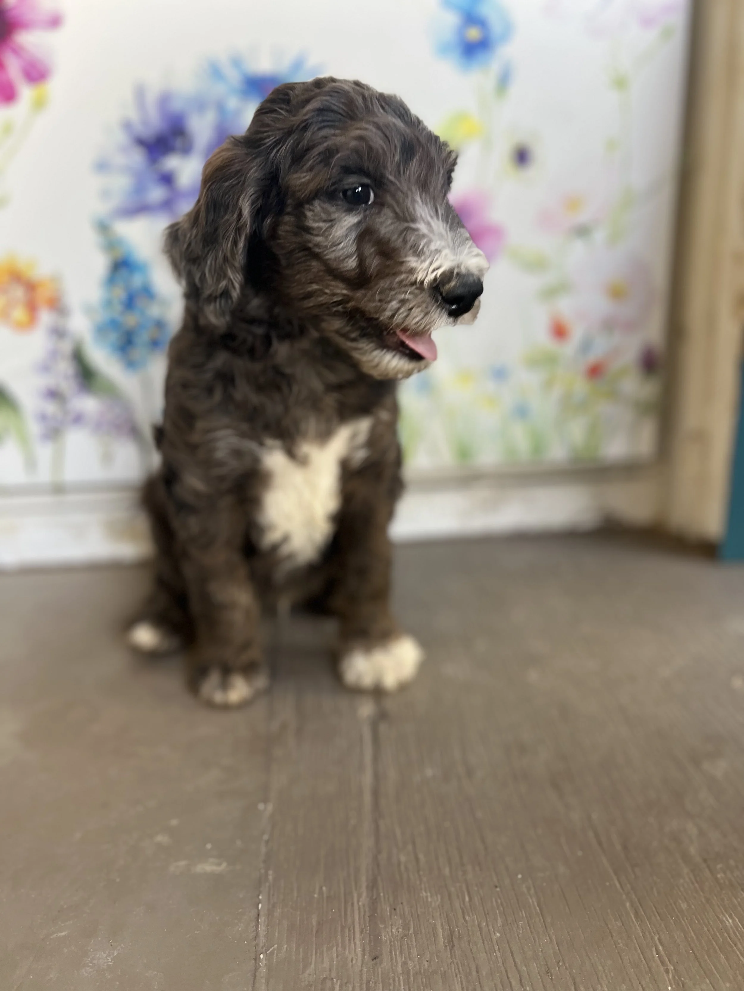 Hank is a beautifully marked chocolate abstract male with a soft white blaze and chest accent. He carries a calm, steady temperament and shows wonderful early signs of trainability. Thoughtful and observant, Hank responds gently to interaction and settles comfortably, making him an excellent fit for families seeking a balanced, affectionate companion. His even disposition and people-focused nature reflect the temperament we intentionally cultivate in our program. Expected medium adult size with a furnished, low-shedding coat.